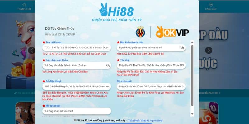 Bước 2: Sau đó, biểu mẫu sẽ hiển thị lên, người chơi tiến hành điền thông tin chính xác và đầy đủ theo yêu cầu cho sẵn. Khi đã nhập xong, bạn check lại xem đã đúng hay chưa rồi click “đăng ký”.